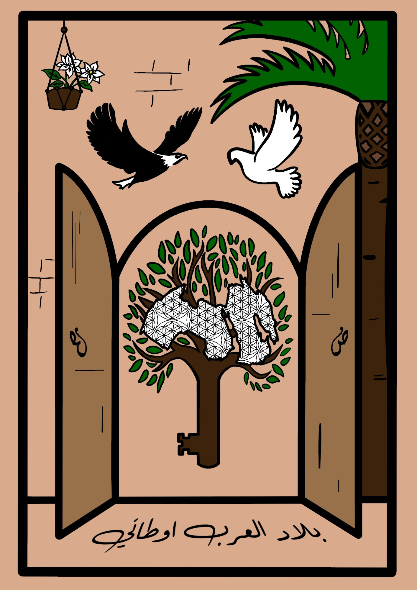 The artwork brings this idea to life, telling a story through every detail. At the heart of the artwork, the key represents more than just unlocking doors; it’s about unlocking potential, breaking barriers, and finding one’s ghaya—the highest purpose. The doors remind us of the spaces we create, the opportunities we open, and the paths we walk together. The Arabic phrase "بلاد العرب أوطاني" ties it all together, echoing a shared identity that transcends borders. No matter where we go, our culture, language, and history connect us.